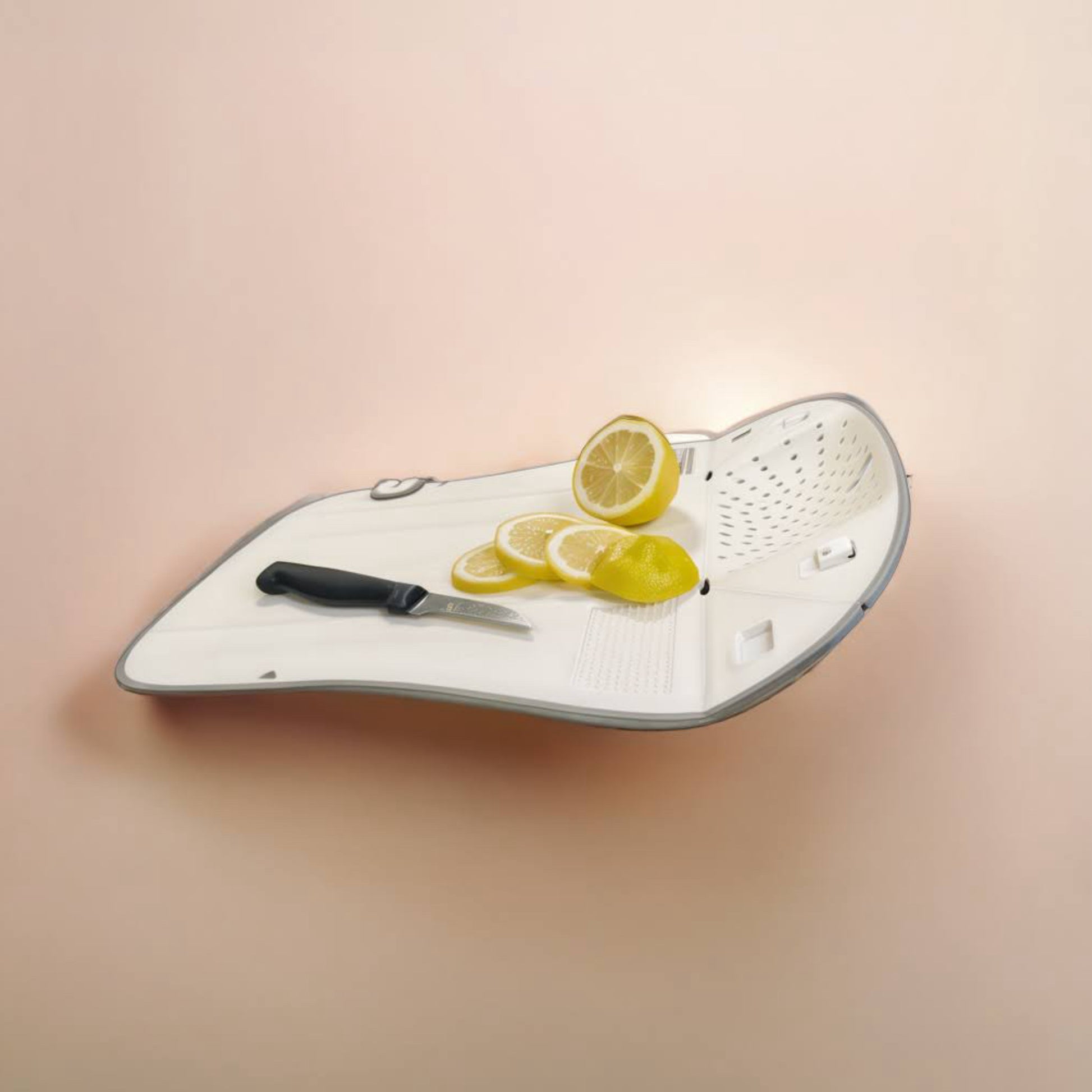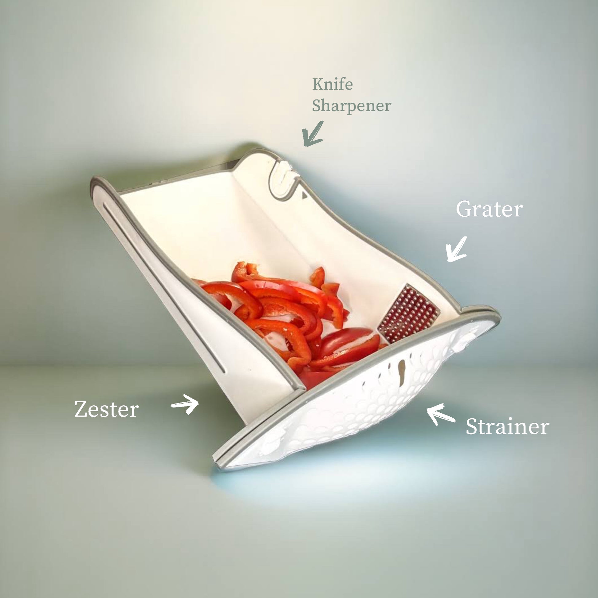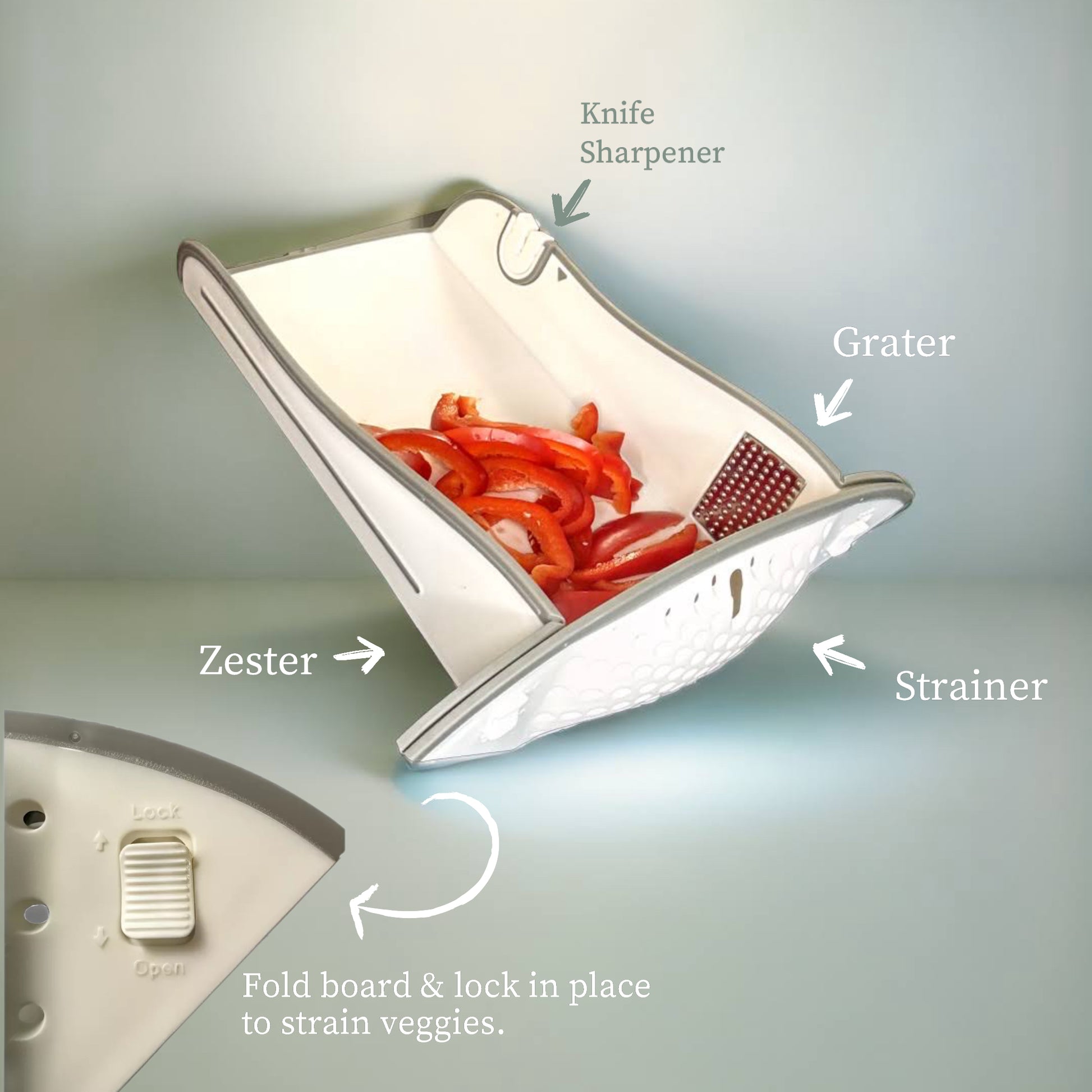 - Strainer: Fold your board & lock it into place to strain veggies in the sink.